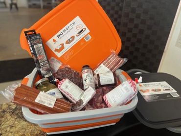 Heat and cut-proof gloves, Wireless meat thermometers, Prep tubs, Peach paper, Heavy duty foil, Tin pans, Spray bottles, Injectors, Smoke tubes, Meat claws, and more!